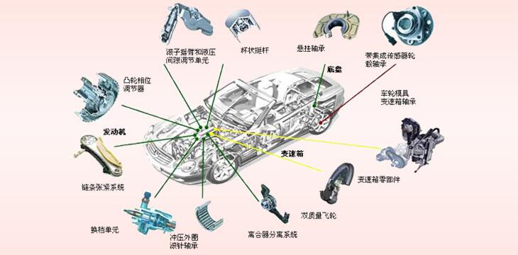 轎車上使用軸承的零部件總成件有:發動機、發電機、水泵、離合器、變速器、差速器、轉向器、空調機等。軸承類型主要是小型深溝球軸承、圓錐滾子軸承、圓柱滾子軸承、角接觸球軸承和滾針軸承等。配套的各類型軸承比例為:深溝球軸承占27%,圓錐軸承23%,滾針軸承15%,水泵軸承6%,圓柱滾子軸承5%,其他軸承24%。
