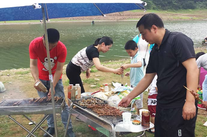 In June 21, 2015, the weather is fine, pleasant climate, employees in Maori barbecue near the reservoir. All ready materials, some people responsible for the series of ingredients, and some responsible for baking, some people responsible for the tent, and some people play a start, a vibrant scene. This day we eat happy, happy to play.